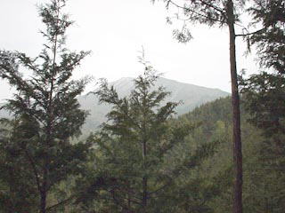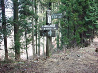 ところどころ置かれた丸太階段を下りたり、ゆるやかな坂を下るにつれ水音が聴こえ、小川が見え隠れする内に2:15樹齢700年の高見杉を通過。杉と桧の植林を右に左に、花粉症の人にとっては「やめてくれ〜」気分の中を20分ほど行って振り返れば、既に山頂は遥か彼方から私達を見下ろしています。