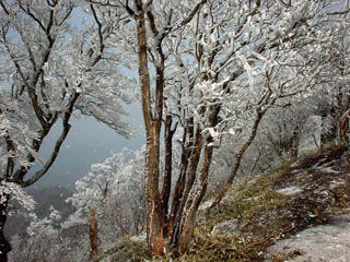 途中、15分続いた霧氷のトンネルは、空腹も忘れさせてくれるほどの美しさ。やはり、高見はこれでなくっちゃね。トンネルが切れる笛吹岩あたりで、ポカポカと風のあたらない、眺めの良い絶好の場所をサブリーダーがゲット。
