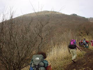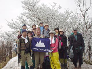 何となく物足りない思いで山頂に臨んでビックリ。いきなりの雪景色。エーッ、今までの道はこの驚きのための前フリやったん?だとしたらなんとも心憎い演出。頂上より向こう側北斜面には、高見山名物ブナの霧氷、霧氷、霧氷…。ようやく冬山気分満喫です。左右の写真、とても同じ日の同じ山とは思えません。ここで念願の?アイゼンを装着して記念撮影。皆さんの顔もうれしそうでしょ。ここで第2回目の昼食タイムといきたかったのですが、山頂はお昼時とあってラッシュアワー状態。避難小屋の中は人息れでボーッと霞むほど。お腹空いたぁ〜と言いながら、場所を探して先に進みます。
