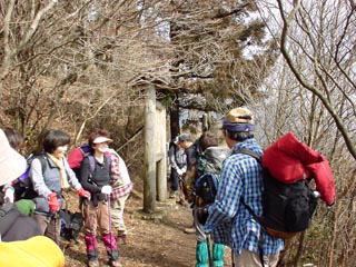 小峠で小休止の後、更に続く旧伊勢南街道を大峠に向って進みます。小峠から2〜3分の所で左手に上がって行くのが旧伊勢南街道。うっかりするとそのまま林道を行ってしまうので、注意。昔の石畳を復元した所あったり、苔むした由緒正しそうな岩があったり、そう苦労する間もなく(雪がないからでしょうか)11:30、大峠到着です。フト下を見るとなんと駐車場が・・。トイレがあるのは助かりますが、もう少し見えないような工夫をしてもらえないでしょうかねぇ、せっせと歩いてきた価値が減ってしまいそうです。ここで第1回目の昼食タイムを取ります。お湯は沸かさずちょっとお腹の足し程度・・・。