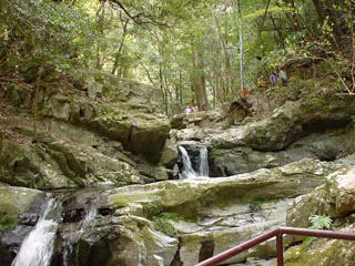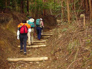 茶店前からは五本松への指示標に従って車道をハイランドパーク粉河へ向います。1時間ほどの予定でしたが、後ろから後輩Kリーダーに「もうちょっと急ぎ足で、温泉に早く入りましょう」とあま〜く囁かれ、足の回転も自然と早くなります。まったく「温泉に行こう」に弱い一団です。13:00粉河到着。ここからの眺めは素晴らしく、遠くの山間に紀ノ川も垣間見えます。5分ほど休憩して犬鳴山に向けて出発。車道を少し歩いた後、左手不動谷への下り道に折れます。ここは丸太ではなく石を積んで整備した階段で、斜度もあれば一