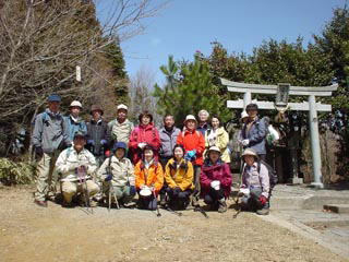 チタイムとなりました。眺めは良いけれど風が強く、お昼をそそくさと切り上げて神社前に戻リ、一応登頂の証拠写真をパチリ。先輩Kリーダーの欠席で今回は会の旗とお馴染みネパール帽もお休みです。