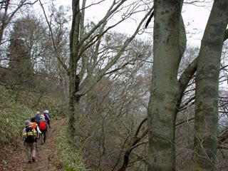 和泉葛城山への山頂は、この車道をそのまま歩くルートもありますが、今回はその途中から右手の「ブナ林ボードウォーク」という葛城神社の下に出る道(木道)へ入ります。このあたりから雪が舞い始め、大きなボタン雪が頭に肩に降りかかりますが、傘をさしたり払ったりする人もなく、恐らく山で見るこの冬最後の雪を惜しみながらブナ林の中を進みます。ここのブナ