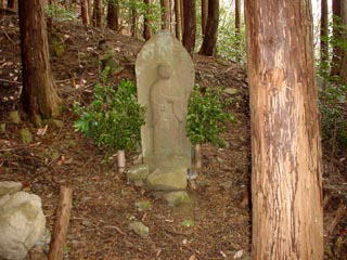 1時間ほどで終点牛滝山に到着。大威徳寺山門の下にトイレがあり身も心もスッキリした所で、9:35山門横の登山道「町石道」から歩き出します。見たところ新しい丸太の階段が延々と続き、30分ほど歩いて小休止。あちこちで1枚脱ぎ、2枚脱ぎと衣服を整えています。又この丸太が2本組みになってる段は高くて、足がと、届かない・・・。歩き始めの1丁のお地蔵さん(町石地蔵)から21丁地蔵まで、右手に1丁ごとに現れるお地蔵さんを見ながら、あと何丁と指折り数えて歩く事1時間、車道にある21丁地蔵に到着です。