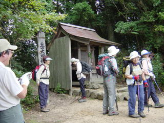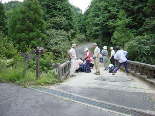 JR甲賀駅に9時集合。 3台しかないタクシーの内、2台を占有して、登山口のある参詣橋まで、ピストン輸送。 後発組が来るまで、身体を動かして準備運動、ヤル気まんまんです。 全員そろった所で、10時丁度に出発します。 |