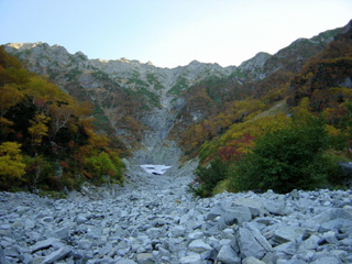明け方からかなりの強風と、吹き降りの音で目が覚めます。今日は下山して上高地を散策し、温泉につかるだけですからそんなに影響はないものの、岳沢の下りを考えると、あまり良い気分ではありません。出発を遅らせて小止みになるのを待とうか悩みますが、予定通り7:30に出発です。雨に濡れた石に足をとられないよう、慎重に上高地へ下っていきます。