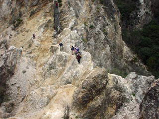 海の景色を眺めながら10分ほどの歩きで鉄拐山(234M)です。30分ほど進む内に眼下に高倉台団地が見え、おらが山休憩所の前を過ぎると、一気に階段の下りになります。元は291Mあった高倉山は、神戸ポートアイランドの埋め立て用に削られ削られ、とうとう団地群に姿を変えてしまいました。団地の中を通って、向いの横尾山へ。下ったら上がらなければなりません。ここも急な階段で、近所の野球部らしい高校生が一往復してゼーゼーいっているのを横目で見ながら、はるかに年上のオジサン・オバサンは戦々恐々。実に300段標高差70M。じっくり15分ほどかけて上り栂尾山を経て横尾山到着。お疲れさまでした〜!結構足にきてますが、ここからが今日のハイライト、須磨アルプス(馬の背)に突入。ヘタる訳には参りません!